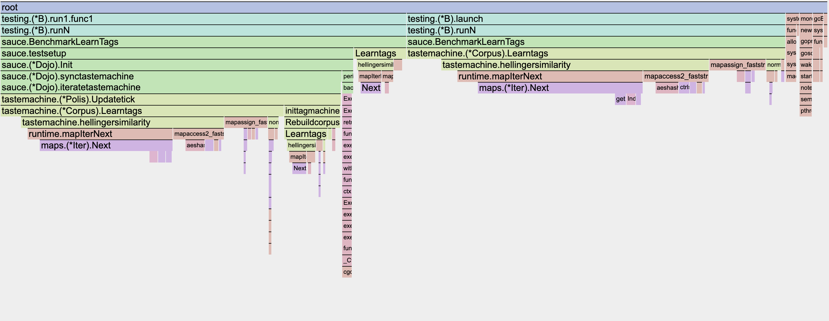 The good news is at least 83% of total time is spent in the golang runtime doing map access and iteration. Most of that (65% of total time) is in the hellinger similarity function which compares two word frequency vectors (hellinger similarity replaced cosine similarity for autistic theoretical reasons but is effectively equivalent). Either golang maps are really slow, or everything else is really fast. For the sake of simplicity to start with I had used maps for the word->frequency vectors, but obviously that's about to change. When I previously wiped out maps from the rest of the taste machine, it got many multiples faster. Now I'm going to do the same here.